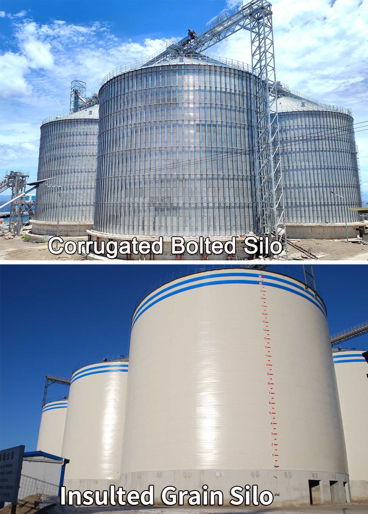 Grain storage is dominated by corrugated bolted steel silos, with a market share of over 90%. This type is technically mature, fast to install, widely applicable, and cost-effective—making it the preferred structure for global grain handling and storage projects. Only when the stored product has special material restrictions (for example, dried fruits, nuts, flour, etc. with strict limitations on galvanized coatings) are aluminum or stainless steel silos considered.