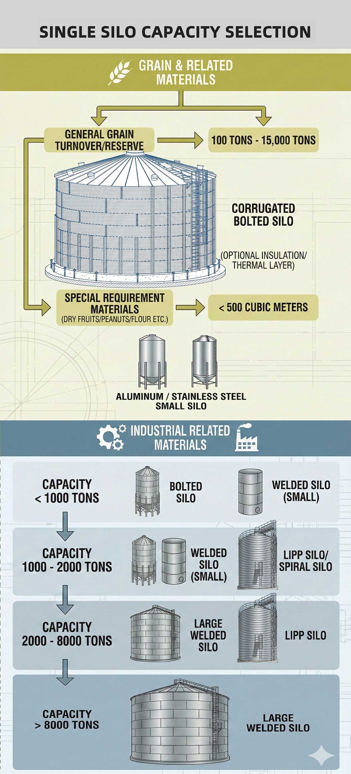 2,000–8,000 t: large welded silo or spiral folded silo